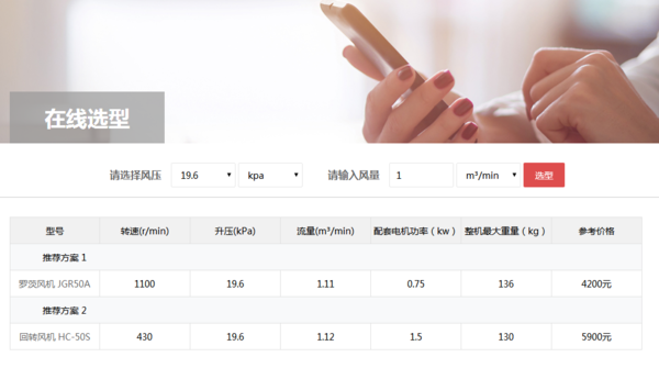 此外,還可以通過(guò)風(fēng)機選型系統查詢(xún)回轉風(fēng)機價(jià)格,如下圖客戶(hù)僅需輸入風(fēng)量、選擇風(fēng)壓,就可以方便、快速、準確、可靠地進(jìn)行羅茨鼓風(fēng)機、回轉式鼓風(fēng)機等各類(lèi)容積式風(fēng)機的選型和價(jià)格查詢(xún)工作。風(fēng)機選型系統地址:http://m.tydsgrfw.cn/search.php